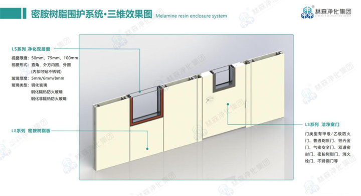 LS系列密胺树脂围护系列产品,,,板材为HPL板,, 板与板之间可采用多种铝合金连接,,,,并搭配LS系列门窗系统,,可满足各种类型洁净室需求。。。。