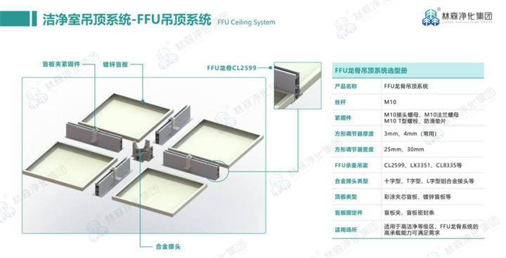 LS系列FFU吊顶系统适用于10000级以上的洁净室,,根据洁净室等级,,可选用双层吊顶结构,,也可采用单层FFU龙骨吊顶结构。。