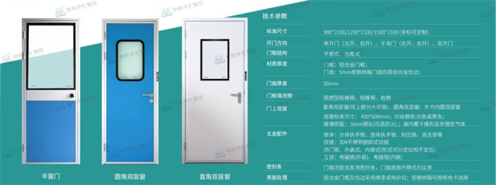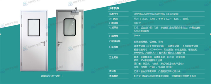 净化铝合金门采用铝合金门框,彩钢板门扇,,,三面采用自发泡胶条密封,底部采用自动升降式扫尘条密封:是专为需要良好密封的洁净室所设计的产品!