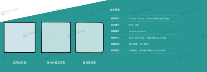 净化双层窗采用四边丝印钢化玻璃;窗内置干燥剂且充惰性气体,,,具有良好的密封性能;视窗与墙体齐平,,,安装灵活,,外观美观等特点;视窗厚度可根据墙体厚度制作。。