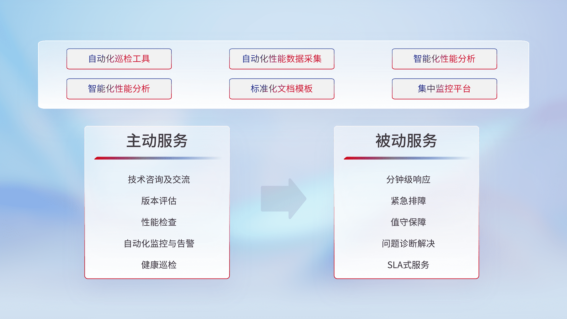 智能化工具和标准化文档,,保障服务质量,,,提供主动服务(包含技术咨询、、、版本评估、、性能检查、、、自动化监控与告警、、、健康巡检)和被动服务包含(分钟级响应、、、紧急排障、、、、值守保障、、、、问题诊断解决、、SLA服务)。。